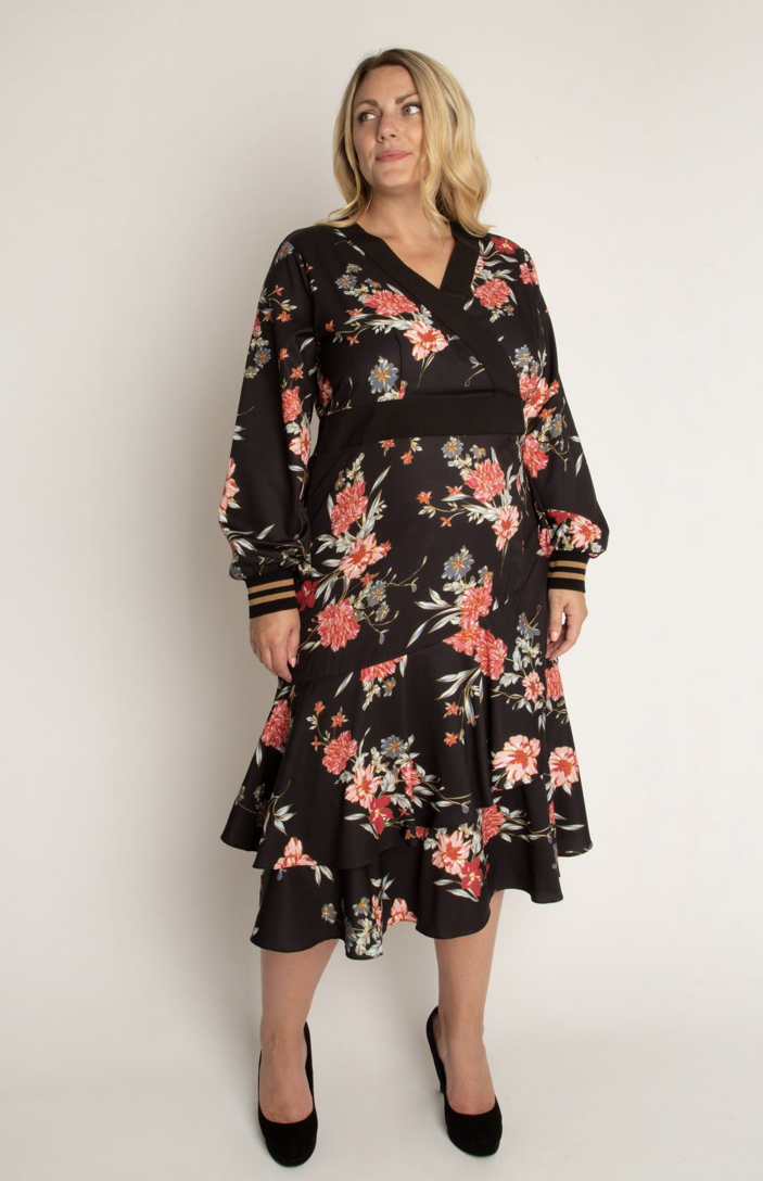 MIDI DRESS LONG SLEEVE BLACK AND RED WITH CUFF DETAIL