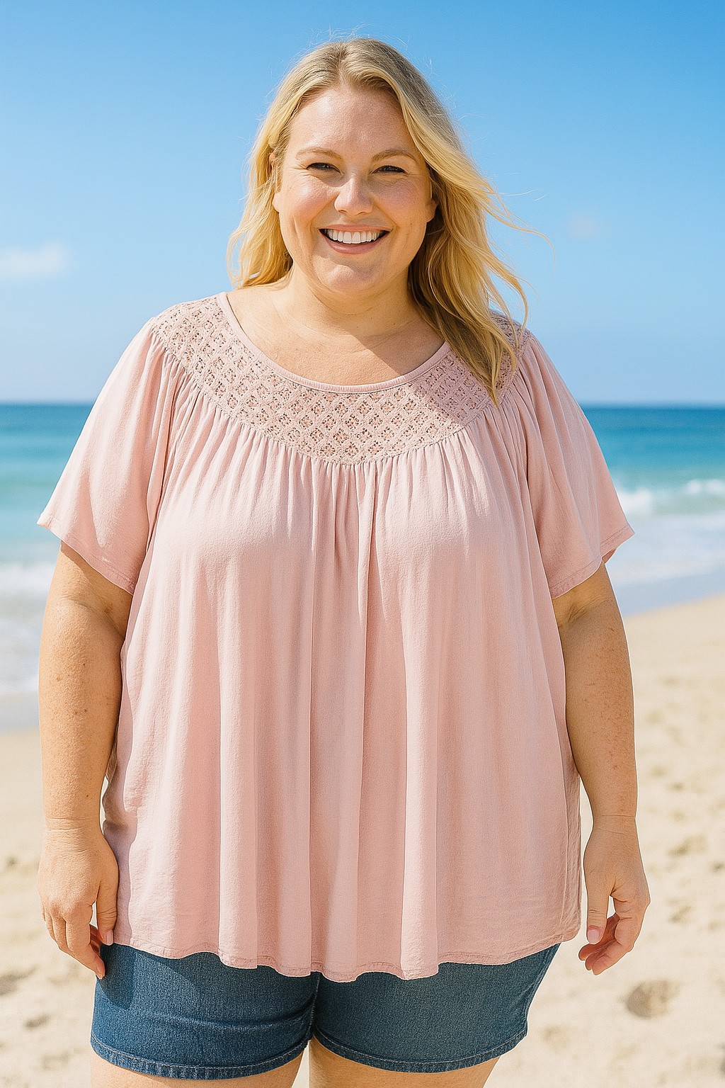 QUALITY LIGHT VISCOSE TOP WITH LACE NECKLINE